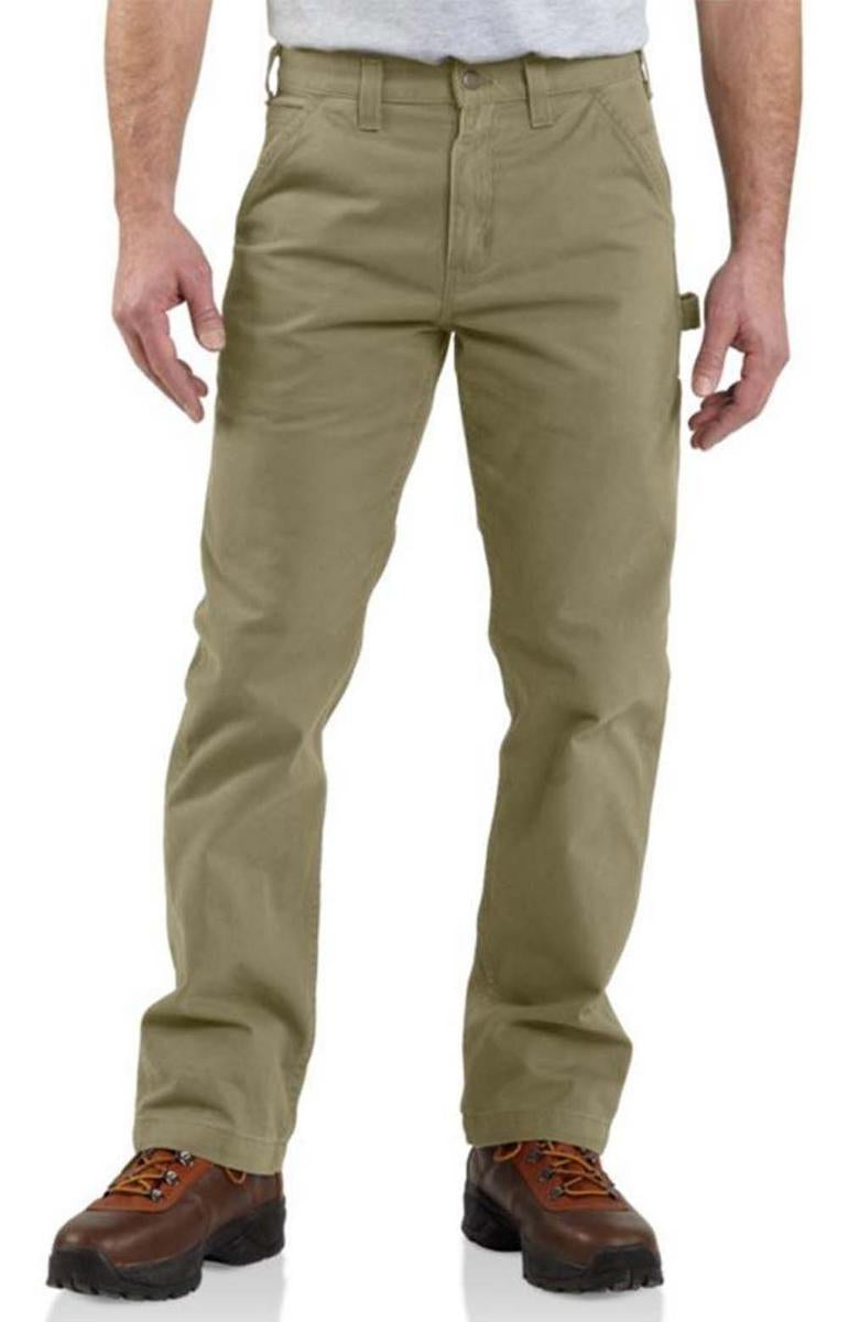 Canvas Khaki Relaxed Fit Pants by Carhartt. Carhartt's washed twill dungaree provides all day comfort and keeps you looking professional on the job. Constructed of 9.25-ounce, 100% cotton ring-spun washed twill with a relaxed-fitting seat and thigh, it sits slightly below the natural waist.