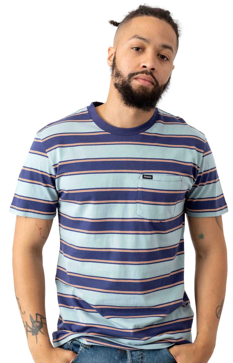 A 150-gram 100% cotton taiored-fit short sleeve knit top featuring yarn dyed stripes, patch pocket, and a woven pocket label.