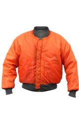 Lightweight MA-1 Flight Jacket by Rothco is the perfect choice for spring and fall. This bomber style jacket is made from a super soft enhanced nylon fabric that is also water repellent and has a matte finish. It features a fully reversible rescue orange lining and left arm utility pocket, two front slash pockets with snap down flaps, two inside slash pockets with snap closure, ribbed knit collar, cuffs and waistband, and brass zippers with leather pull-tabs.