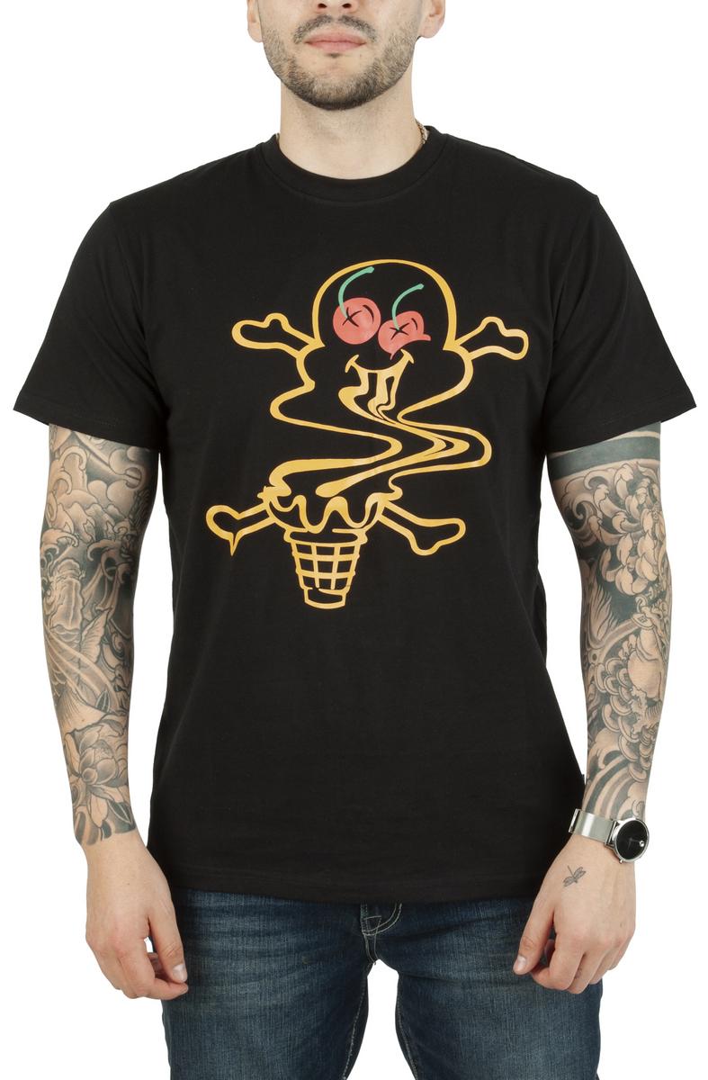 The reliable Cone & Bones keeps on grinning on the front of this all-cotton tee even as his molecules are going haywire.