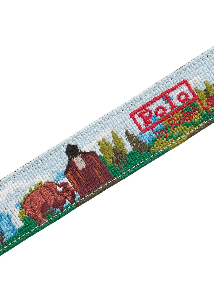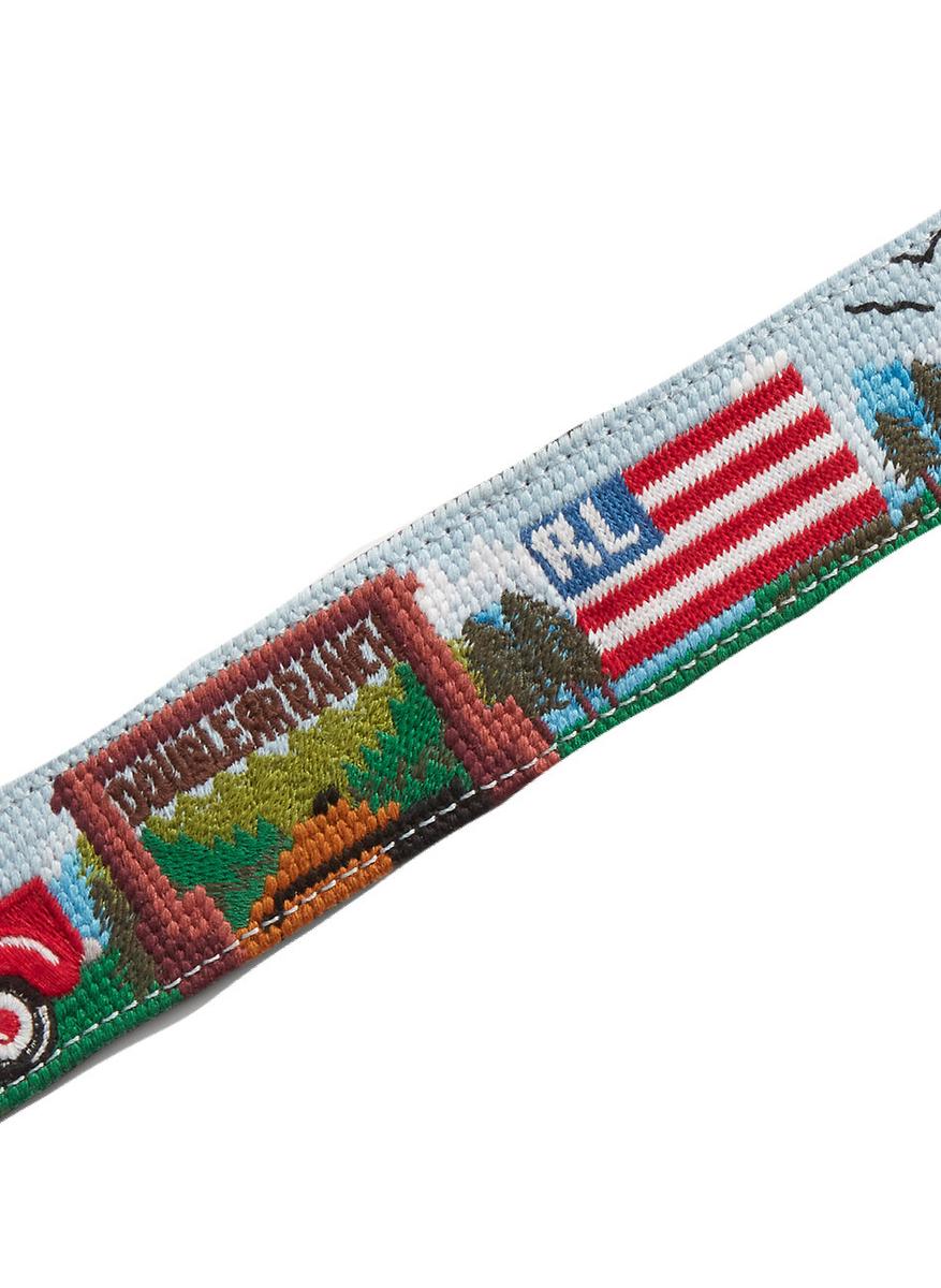 Inspired by Ralph Lauren’s love of the American West, this leather-trimmed needlepoint belt features the iconic Polo Bear, a flag, and scenes from ranch life against a backdrop of snow-capped mountains.