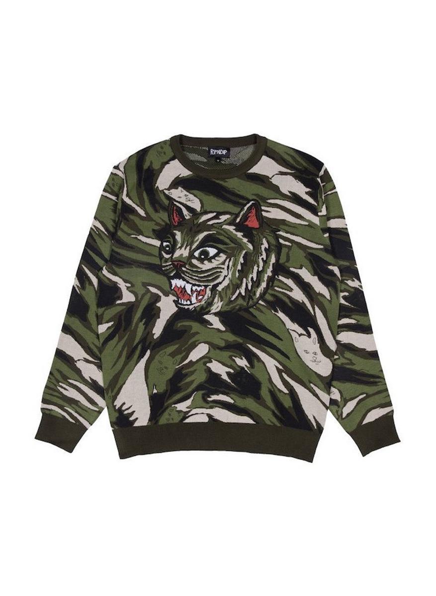 Introducing the latest addition to the RIPNDIP collection - the Tiger Nerm Knit Sweater. This unique and eye-catching sweater features a bold green camo print with a fierce tiger graphic on the front. Made from high-quality knit material, this sweater is not only stylish but also comfortable and durable.
